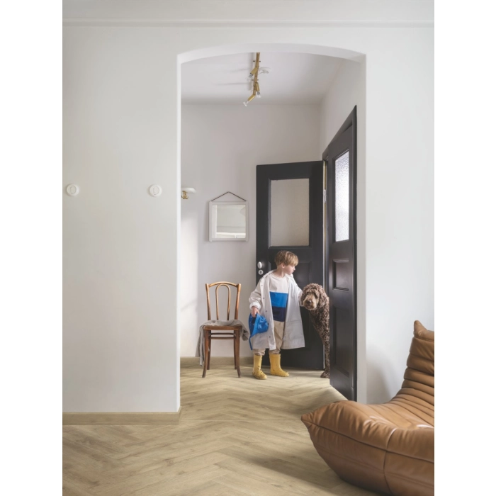 Jodełka klasyczna Vorma przeznaczona jest do montażu na tzw. click, nawet na nierównym podłożu. Jest to kolekcja paneli 1 lamelowa z fazą czterostronną posiadająca odporność na wilgoć AQUA SAFE. Podłogi winylowe Pergo są antypoślizgowe, a także zostały przebadane pod kątem reakcji na ogień (EN13501) i spełniają normę Bfl-s1. Produkty dopasowane kolorystycznie do tej kolekcji to: - listwy przypodłogowe - ich powierzchnia jest odporna na ścieranie oraz zarysowania; - listwy dylatacyjne Incizo - służą do zakrywania dylatacji pomiędzy: ścianą, oknem, progiem, dwiema podłogami tej samej wysokości lub o różnej wysokości np. pomiędzy podłogą, a wykładziną dywanową; - nakładka schodowa - wytrzymała winylowa osłona progu z zaokrąglonym brzegiem stopnia w celu atrakcyjnego wykończenia schodów (łatwy montaż na klej).